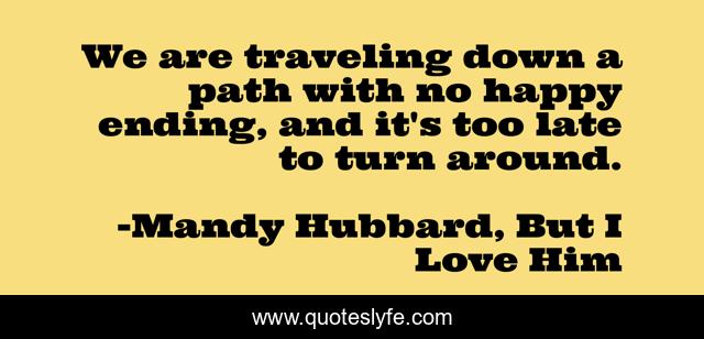 This page presents the quote "We are traveling down a path with no happy ending, and it's too late to turn around.". Author of this quote is Mandy Hubbard, But I Love Him. This quote is about love, affection, sad,.
