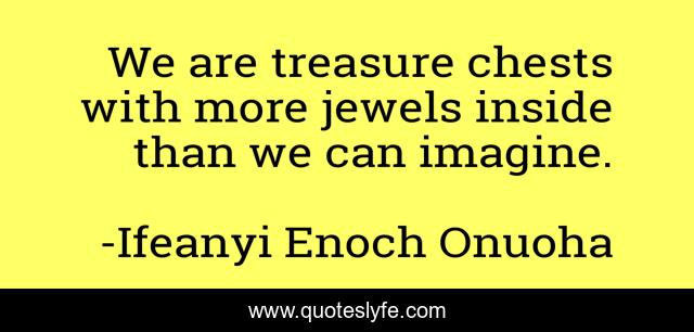 This page presents the quote "We are treasure chests with more jewels inside than we can imagine.". Author of this quote is Ifeanyi Enoch Onuoha. This quote is about treasure, gold, imagineering, gifted, blessed, thought, ifeanyi-enoch-onuoha, potential, imagine,.
