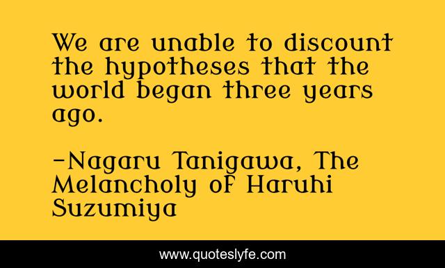 This page presents the quote "We are unable to discount the hypotheses that the world began three years ago.". Author of this quote is Nagaru Tanigawa, The Melancholy of Haruhi Suzumiya. This quote is about humor, scientific-theories, humour, time,.