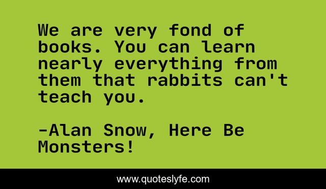 This page presents the quote "We are very fond of books. You can learn nearly everything from them that rabbits can't teach you.". Author of this quote is Alan Snow, Here Be Monsters!. This quote is about books, rabbits, monsters,.