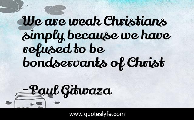 This page presents the quote "We are weak Christians simply because we have refused to be bondservants of Christ". Author of this quote is Paul Gitwaza. This quote is about jesus-christ, servante, bishops, church-leadership, god-s-plan, simple-life, christianity, apostles, pastors,.