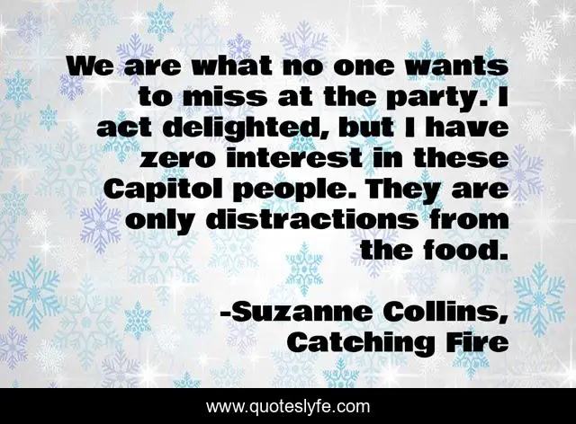 This page presents the quote "We are what no one wants to miss at the party. I act delighted, but I have zero interest in these Capitol people. They are only distractions from the food.". Author of this quote is Suzanne Collins, Catching Fire. This quote is about food, humor,.