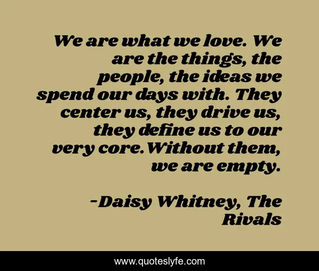 This page presents the quote "We are what we love. We are the things, the people, the ideas we spend our days with. They center us, they drive us, they define us to our very core.Without them, we are empty.". Author of this quote is Daisy Whitney, The Rivals. .