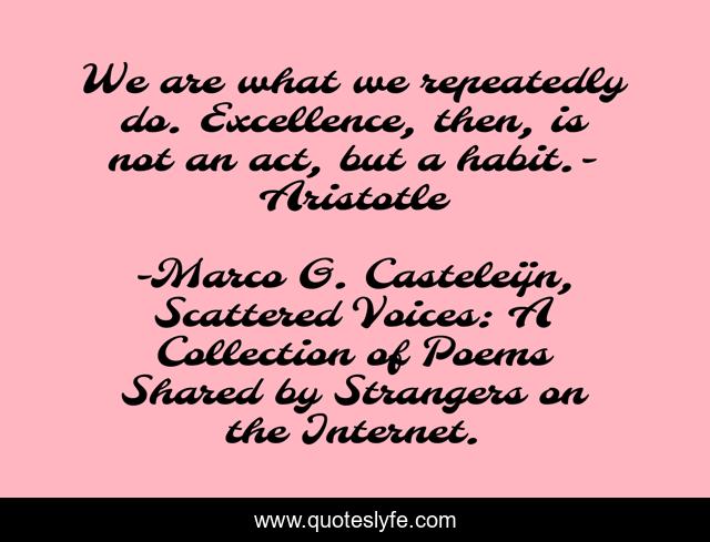 This page presents the quote "We are what we repeatedly do. Excellence, then, is not an act, but a habit.- Aristotle". Author of this quote is Marco G. Casteleijn, Scattered Voices: A Collection of Poems Shared by Strangers on the Internet.. This quote is about excellence, aristotle, habit,.