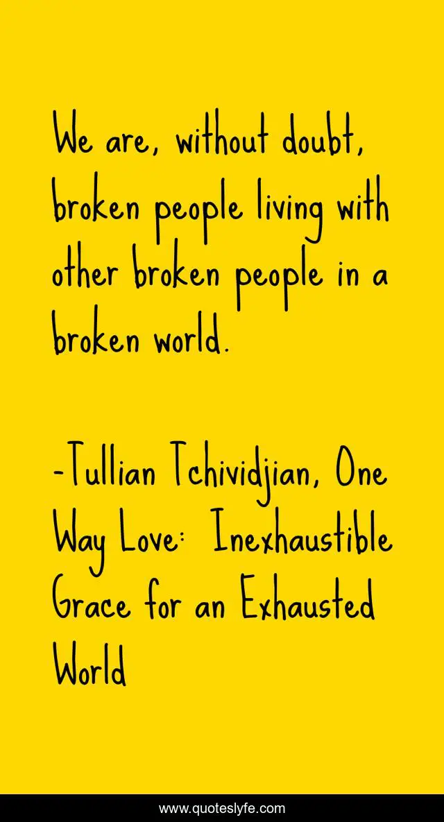 This page presents the quote "We are, without doubt, broken people living with other broken people in a broken world.". Author of this quote is Tullian Tchividjian, One Way Love: Inexhaustible Grace for an Exhausted World. This quote is about broken, grace,.