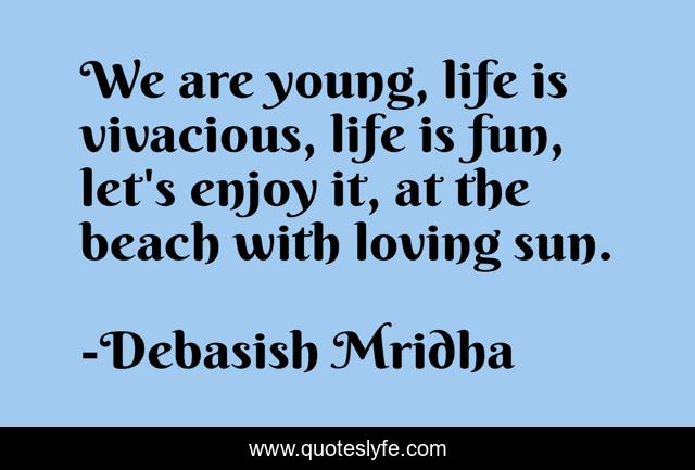 This page presents the quote "We are young, life is vivacious, life is fun, let's enjoy it, at the beach with loving sun.". Author of this quote is Debasish Mridha. This quote is about enjoy, life, love, joy, young, young-love, sun, beach, affection,.