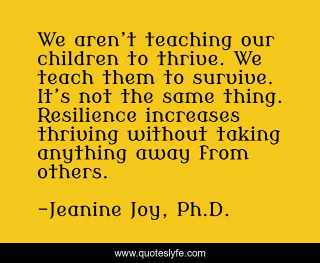 This page presents the quote "We aren’t teaching our children to thrive. We teach them to survive. It’s not the same thing. Resilience increases thriving without taking anything away from others.". Author of this quote is Jeanine Joy, Ph.D.. This quote is about education, survival, parenting-children, parenting, win-win-win, human-thriving, resilience, thrive,.