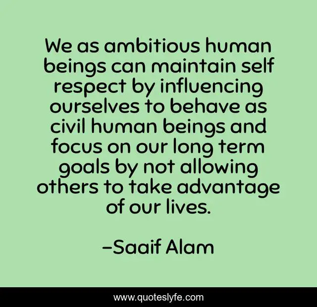 This page presents the quote "We as ambitious human beings can maintain self respect by influencing ourselves to behave as civil human beings and focus on our long term goals by not allowing others to take advantage of our lives.". Author of this quote is Saaif Alam. This quote is about enthusiasm, defensiveness, education, inspirational,.