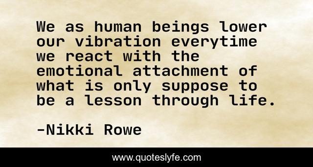 This page presents the quote "We as human beings lower our vibration everytime we react with the emotional attachment of what is only suppose to be a lesson through life.". Author of this quote is Nikki Rowe. This quote is about courage, higher-conciousness, energy, rise, know-yourself, awakening, vibrations, conciousness, awareness,.
