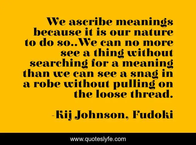 This page presents the quote "We ascribe meanings because it is our nature to do so..We can no more see a thing without searching for a meaning than we can see a snag in a robe without pulling on the loose thread.". Author of this quote is Kij Johnson, Fudoki. .