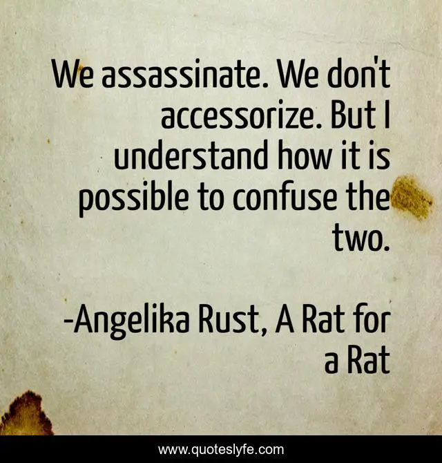 "Angelika Rust, A Rat for a Rat Quotes." Quoteslyfe.com, 2025. Fri. 05 Dec. 2025. <https://www.quoteslyfe.com/quote/We-assassinate-We-don-t-accessorize-But-193518>.