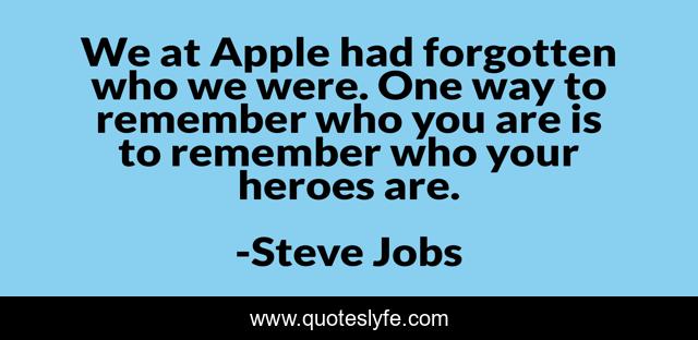 This page presents the quote "We at Apple had forgotten who we were. One way to remember who you are is to remember who your heroes are.". Author of this quote is Steve Jobs. This quote is about who-are-you, apple, forgot, heroes, identity, remember,.