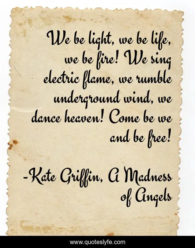 This page presents the quote "We be light, we be life, we be fire! We sing electric flame, we rumble underground wind, we dance heaven! Come be we and be free!". Author of this quote is Kate Griffin, A Madness of Angels. This quote is about blue, angels, magic, electric,.