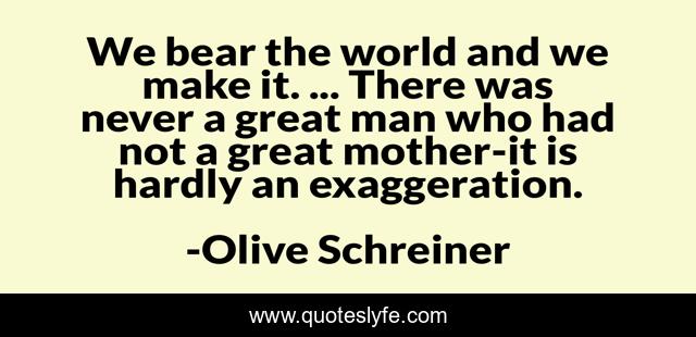 This page presents the quote "We bear the world and we make it. ... There was never a great man who had not a great mother-it is hardly an exaggeration.". Author of this quote is Olive Schreiner. This quote is about helping, people,.