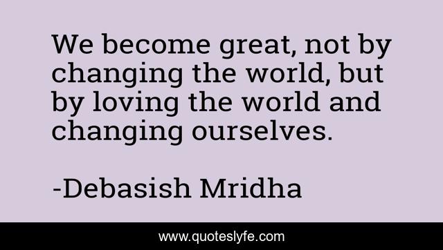 This page presents the quote "We become great, not by changing the world, but by loving the world and changing ourselves.". Author of this quote is Debasish Mridha. This quote is about life, love, knowledge, inspirational, intelligence, philosophy, wisdom, quotes, affection,.