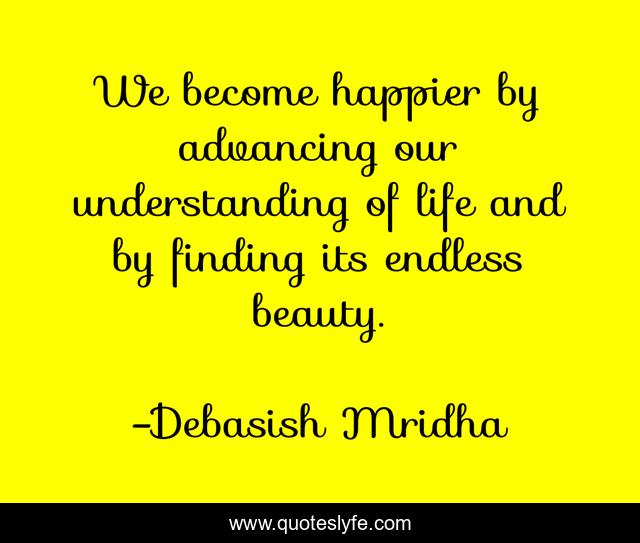 This page presents the quote "We become happier by advancing our understanding of life and by finding its endless beauty.". Author of this quote is Debasish Mridha. This quote is about how-to-be-happier, philosophy, debasish-mridha, quotes, understanding-life, inspirational, enthusiasm, beauty-of-life, debasish-mridha-m-d,.