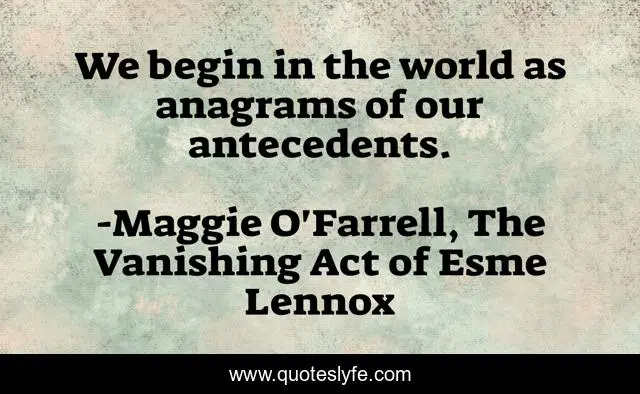 This page presents the quote "We begin in the world as anagrams of our antecedents.". Author of this quote is Maggie O'Farrell, The Vanishing Act of Esme Lennox. This quote is about metaphor, anagrams,.