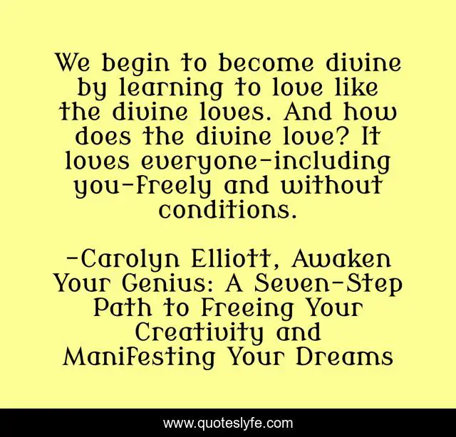 This page presents the quote "We begin to become divine by learning to love like the divine loves. And how does the divine love? It loves everyone-including you-freely and without conditions.". Author of this quote is Carolyn Elliott, Awaken Your Genius: A Seven-Step Path to Freeing Your Creativity and Manifesting Your Dreams. This quote is about genius, self-help, wisdom,.