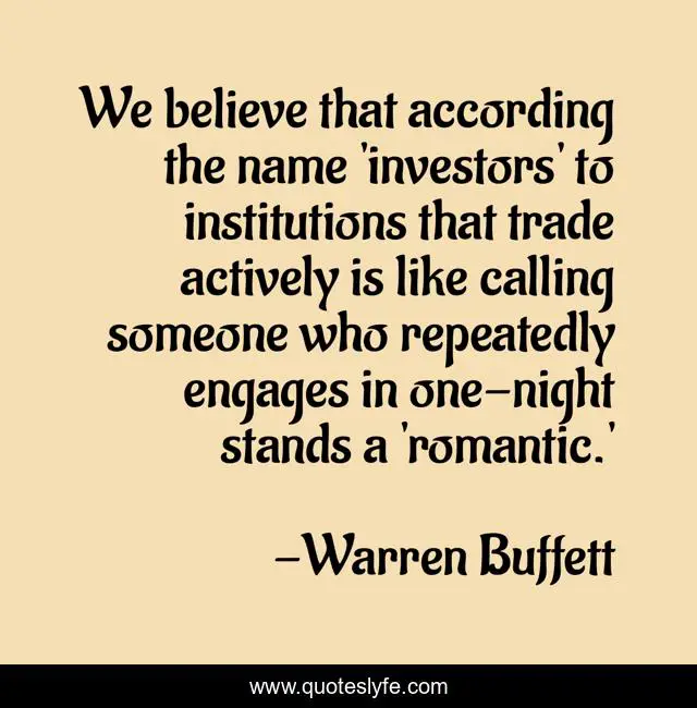 This page presents the quote "We believe that according the name 'investors' to institutions that trade actively is like calling someone who repeatedly engages in one-night stands a 'romantic.'". Author of this quote is Warren Buffett. This quote is about believe, name, like,.