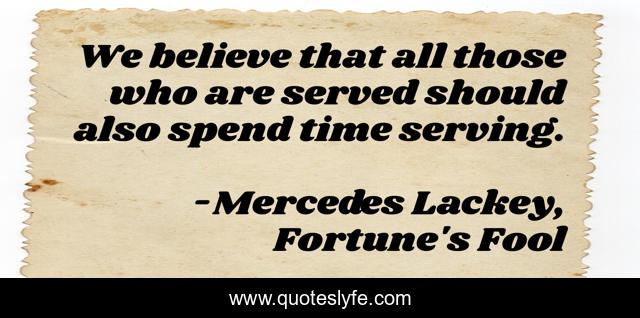 This page presents the quote "We believe that all those who are served should also spend time serving.". Author of this quote is Mercedes Lackey, Fortune's Fool. .