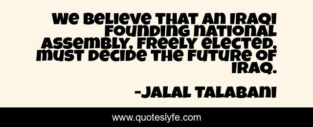This page presents the quote "We believe that an Iraqi founding national assembly, freely elected, must decide the future of Iraq.". Author of this quote is Jalal Talabani. This quote is about believe, decide,.