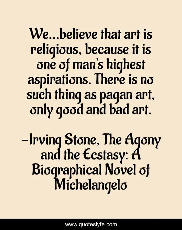 "Irving Stone, The Agony and the Ecstasy: A Biographical Novel of Michelangelo Quotes." Quoteslyfe.com, 2025. Mon. 08 Dec. 2025. <https://www.quoteslyfe.com/quote/We-believe-that-art-is-religious-because-29969>.
