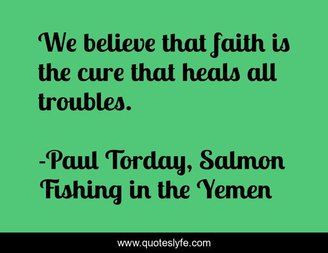 This page presents the quote "We believe that faith is the cure that heals all troubles.". Author of this quote is Paul Torday, Salmon Fishing in the Yemen. .