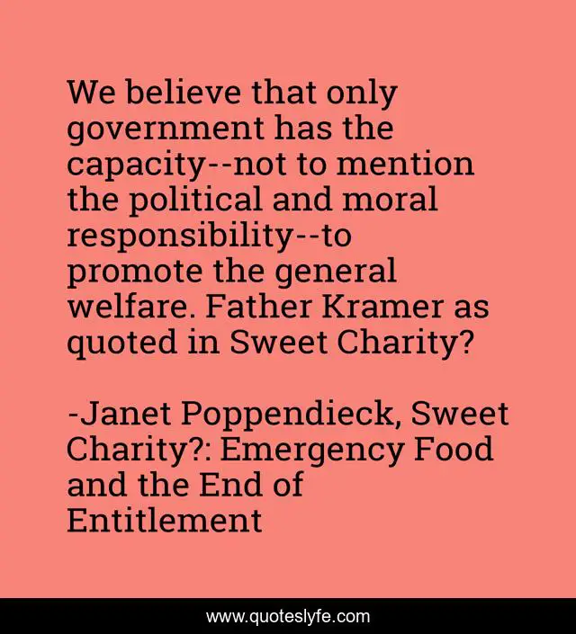 This page presents the quote "We believe that only government has the capacity--not to mention the political and moral responsibility--to promote the general welfare. Father Kramer as quoted in Sweet Charity?". Author of this quote is Janet Poppendieck, Sweet Charity?: Emergency Food and the End of Entitlement. This quote is about general-welfare, public-service, moral-responsibility, government-programs, charity,.