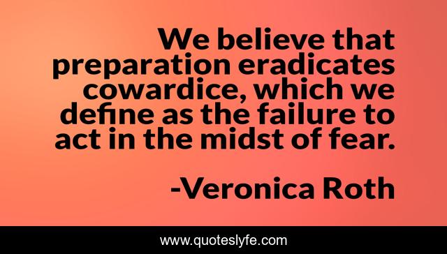 This page presents the quote "We believe that preparation eradicates cowardice, which we define as the failure to act in the midst of fear.". Author of this quote is Veronica Roth. This quote is about cowardice, four, brave, dauntless, tris,.