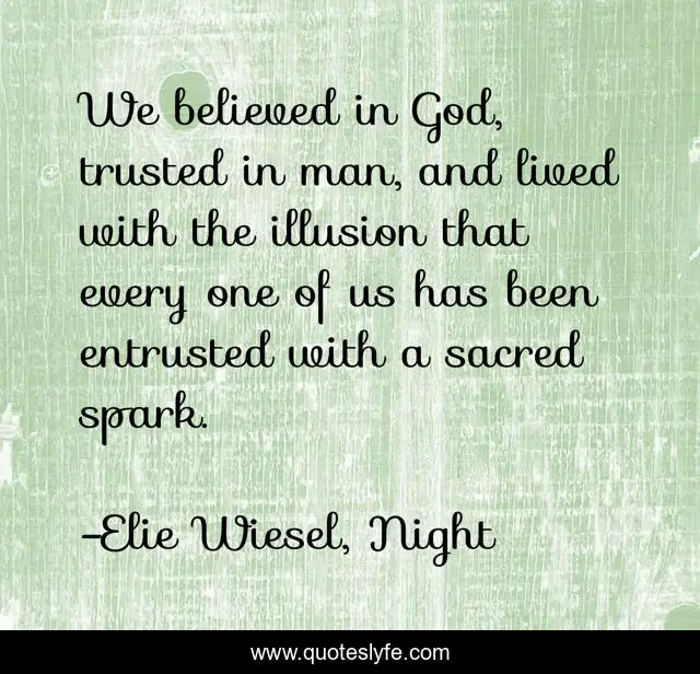This page presents the quote "We believed in God, trusted in man, and lived with the illusion that every one of us has been entrusted with a sacred spark.". Author of this quote is Elie Wiesel, Night. This quote is about sacred-spark, belief-in-god, trust,.