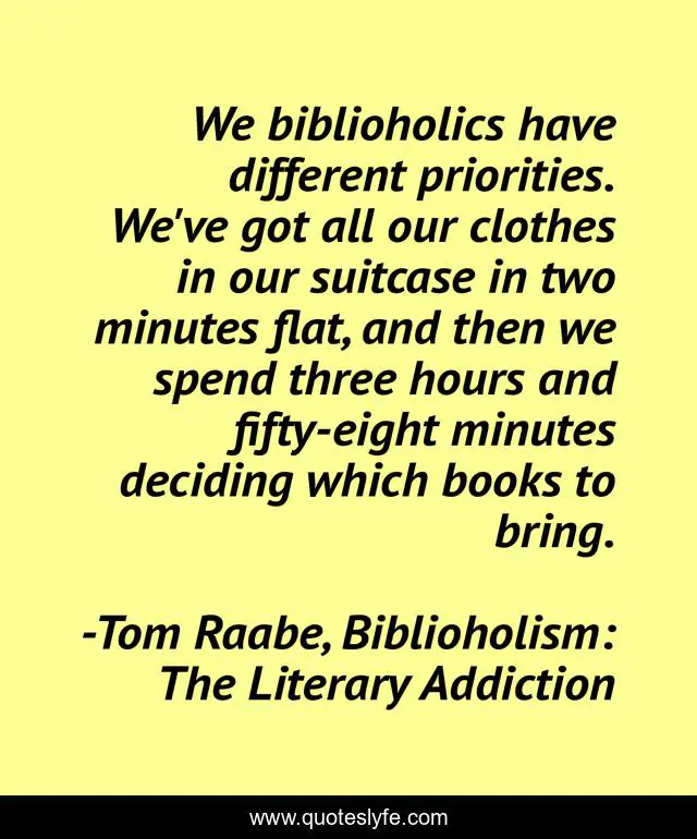 "Tom Raabe, Biblioholism: The Literary Addiction Quotes." Quoteslyfe.com, 2025. Fri. 05 Dec. 2025. <https://www.quoteslyfe.com/quote/We-biblioholics-have-different-priorities-We-ve-137349>.