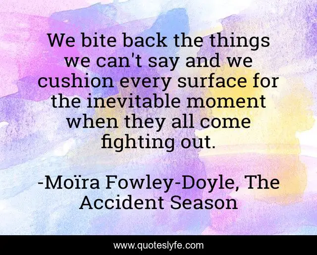 This page presents the quote "We bite back the things we can't say and we cushion every surface for the inevitable moment when they all come fighting out.". Author of this quote is Moïra Fowley-Doyle, The Accident Season. This quote is about ya, the-accident-season, literature, young-adult, moïra-fowley-doyle,.