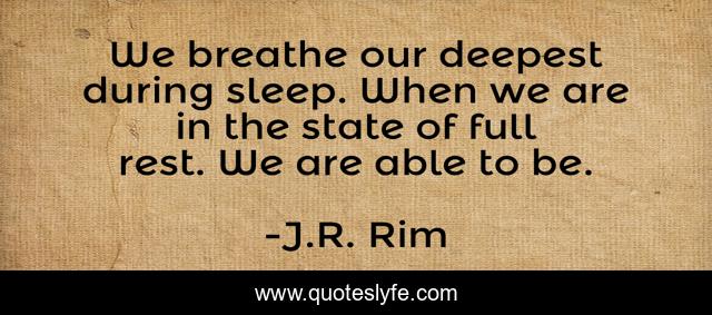 This page presents the quote "We breathe our deepest during sleep. When we are in the state of full rest. We are able to be.". Author of this quote is J.R. Rim. This quote is about breathe, be, being, breathing-in-awareness, breathe-deep, breath-of-life, deep-breath, restoration, sleep,.