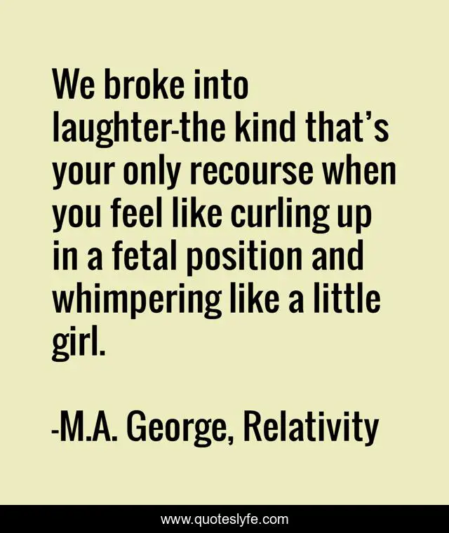 This page presents the quote "We broke into laughter—the kind that’s your only recourse when you feel like curling up in a fetal position and whimpering like a little girl.". Author of this quote is M.A. George, Relativity. This quote is about little-girl, fetal-position, whimper, laughter, paranormal-romance,.