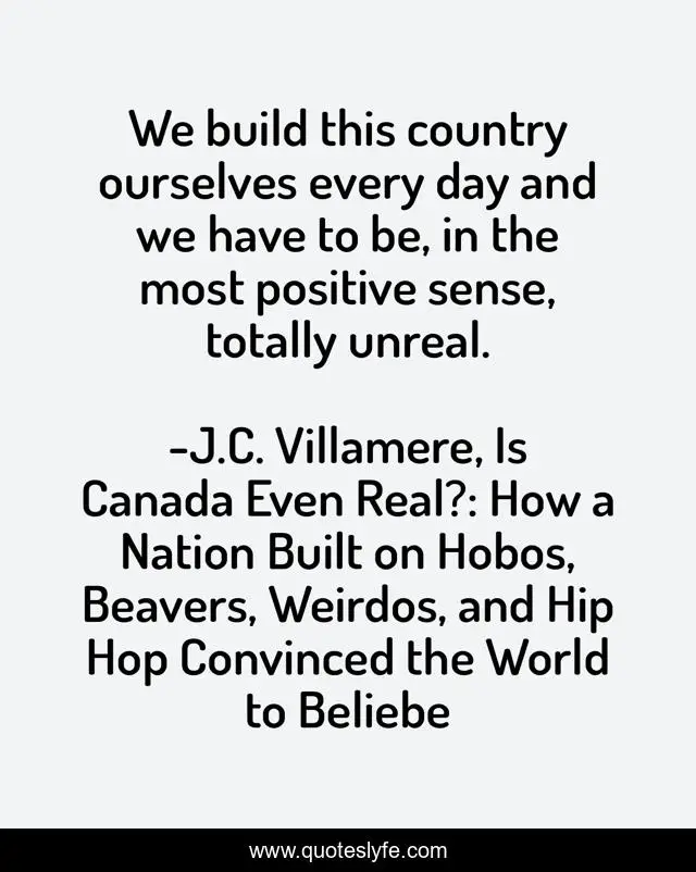 This page presents the quote "We build this country ourselves every day and we have to be, in the most positive sense, totally unreal.". Author of this quote is J.C. Villamere, Is Canada Even Real?: How a Nation Built on Hobos, Beavers, Weirdos, and Hip Hop Convinced the World to Beliebe. This quote is about canadian, cultural-differences, cultural-identity, culture, canada-inspirational, pop-culture, canadian-literature, canadastrong,.
