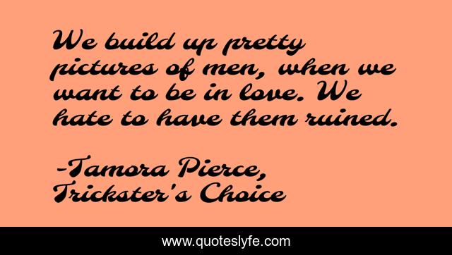 This page presents the quote "We build up pretty pictures of men, when we want to be in love. We hate to have them ruined.". Author of this quote is Tamora Pierce, Trickster's Choice. This quote is about men, love, affection,.