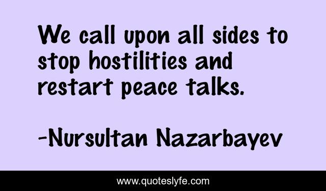 This page presents the quote "We call upon all sides to stop hostilities and restart peace talks.". Author of this quote is Nursultan Nazarbayev. This quote is about stop, call, sides,.