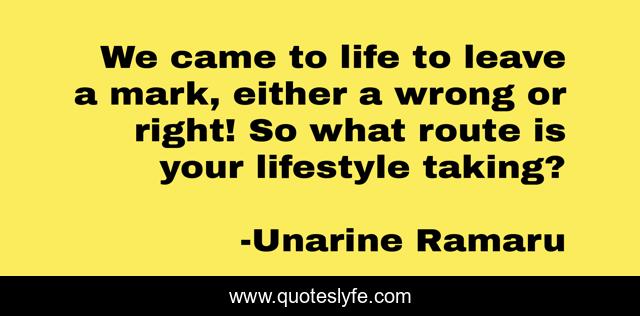 This page presents the quote "We came to life to leave a mark, either a wrong or right! So what route is your lifestyle taking?". Author of this quote is Unarine Ramaru. This quote is about motivation, right, lifestyle, wrong, choices,.