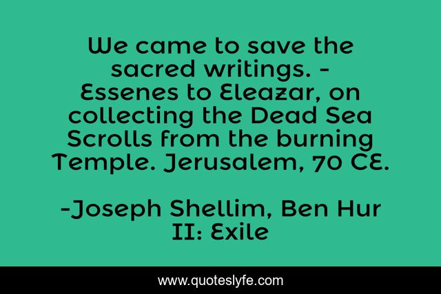 This page presents the quote "We came to save the sacred writings. - Essenes to Eleazar, on collecting the Dead Sea Scrolls from the burning Temple. Jerusalem, 70 CE.". Author of this quote is Joseph Shellim, Ben Hur II: Exile. This quote is about rome, israel, jerusalem, dead-sea-scrolls, war,.