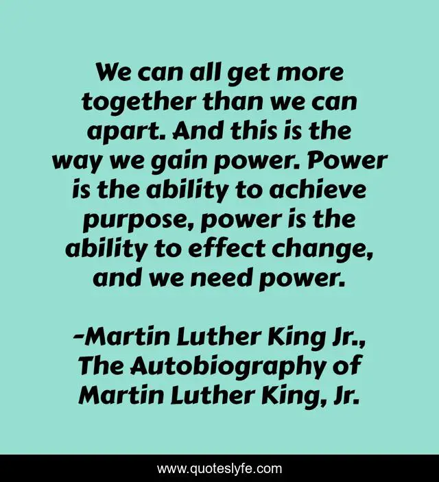 This page presents the quote "We can all get more together than we can apart. And this is the way we gain power. Power is the ability to achieve purpose, power is the ability to effect change, and we need power.". Author of this quote is Martin Luther King Jr., The Autobiography of Martin Luther King, Jr.. This quote is about change, power, purpose,.