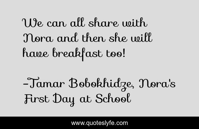 This page presents the quote "We can all share with Nora and then she will have breakfast too!". Author of this quote is Tamar Bobokhidze, Nora's First Day at School. This quote is about cute, baby-animal-stories, sharing, baby-animal, daycare, social-behavior, picture-book, early-learning, growing-up,.