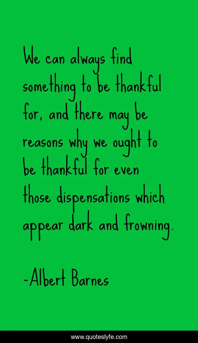 This page presents the quote "We can always find something to be thankful for, and there may be reasons why we ought to be thankful for even those dispensations which appear dark and frowning.". Author of this quote is Albert Barnes. This quote is about dark, be thankful, why,.