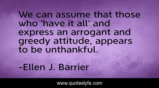 This page presents the quote "We can assume that those who ‘have it all’ and express an arrogant and greedy attitude, appears to be unthankful.". Author of this quote is Ellen J. Barrier. This quote is about behaviour, unthankful, attitude, greedy, arrogant,.