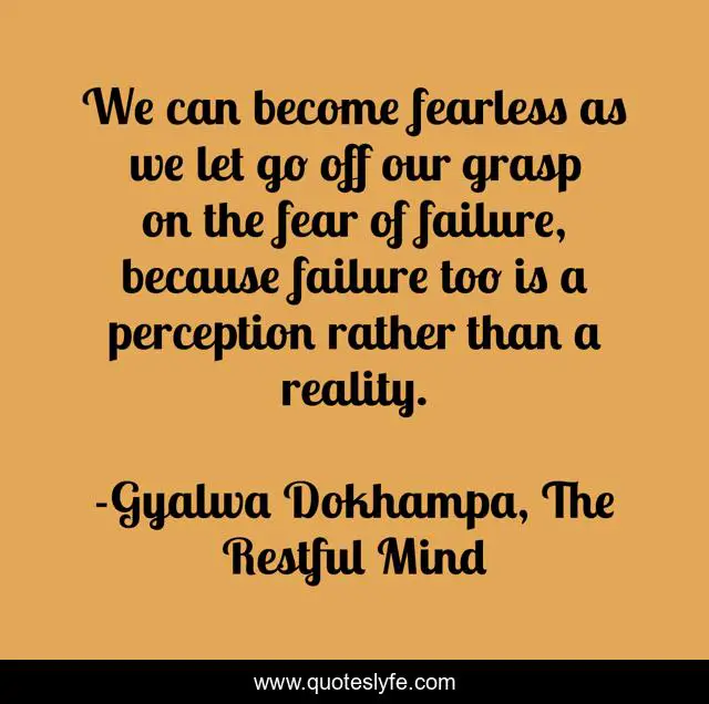 This page presents the quote "We can become fearless as we let go off our grasp on the fear of failure, because failure too is a perception rather than a reality.". Author of this quote is Gyalwa Dokhampa, The Restful Mind. This quote is about perception, fearless, reality, failure, inspirational, enthusiasm,.