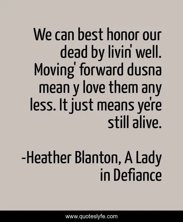 This page presents the quote "We can best honor our dead by livin' well. Moving' forward dusna mean y love them any less. It just means ye're still alive.". Author of this quote is Heather Blanton, A Lady in Defiance. This quote is about living-life-to-the-fullest, inspirational-living, living-in-the-present, christian-living, western-historical-romance,.