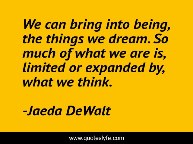 This page presents the quote "We can bring into being, the things we dream. So much of what we are is, limited or expanded by, what we think.". Author of this quote is Jaeda DeWalt. This quote is about wise-words, the-power-of-thoughts, realizing-your-dreams, wisdom, behaviour, attitude, inspirational, enthusiasm, thought-energy,.