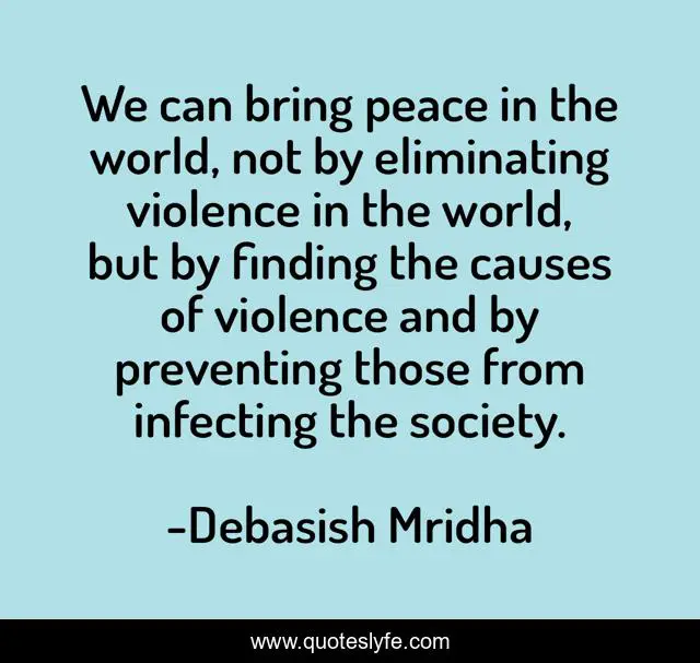 This page presents the quote "We can bring peace in the world, not by eliminating violence in the world, but by finding the causes of violence and by preventing those from infecting the society.". Author of this quote is Debasish Mridha. This quote is about life, love, knowledge, inspirational, intelligence, philosophy, wisdom, quotes, affection,.