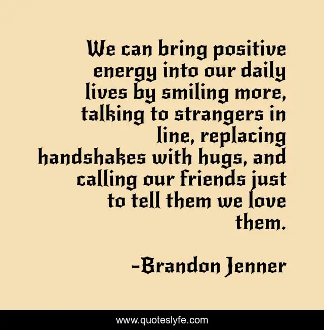 This page presents the quote "We can bring positive energy into our daily lives by smiling more, talking to strangers in line, replacing handshakes with hugs, and calling our friends just to tell them we love them.". Author of this quote is Brandon Jenner. This quote is about positive, confidence, friends, daily,.
