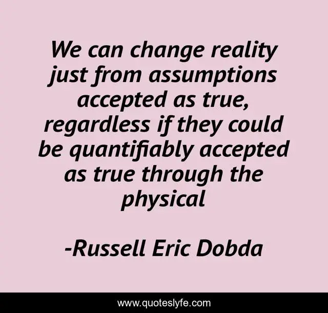 This page presents the quote "We can change reality just from assumptions accepted as true, regardless if they could be quantifiably accepted as true through the physical". Author of this quote is Russell Eric Dobda. This quote is about assumptions, reality,.