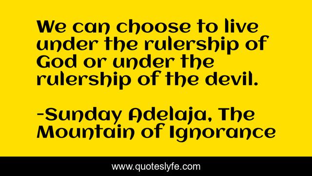 This page presents the quote "We can choose to live under the rulership of God or under the rulership of the devil.". Author of this quote is Sunday Adelaja, The Mountain of Ignorance. This quote is about god-s-rulership, mountain, life, devil, darkness, power, danger, god, people,.
